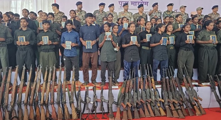 छत्तीसगढ़ के दंडकारण्य क्षेत्र में शुक्रवार को 208 नक्सलियों ने आत्मसमर्पण किया। इनमें 110 महिलाएं और 98 पुरुष शामिल हैं। सरेंडर करने वालेनक्सलियों को संविधान की कॉपी और गुलाब का फूल दिया गया। इन्हें अब सरकार की पुनर्वास योजना का लाभ मिल सकेगा। इसके साथ ही, अबूझमाड़ का अधिकांश हिस्सा नक्सली प्रभाव से मुक्त हो जाएगा और बड़ी संख्या में नक्सलियों के सरेंडर के बाद माना जा रहा है कि उत्तरी बस्तर मेंकाफी हद तक लाल आतंक का अंत हो जाएगा। अब केवल दक्षिणी बस्तर ही बचा है। आत्मसमर्पण के दौरान कुल 153 हथियार भी अधिकारियोंको सौंपे गए। इन हथियारों में 19 एके-47 राइफल, 17 एसएलआर राइफल, 23 इंसास राइफल, 1 इंसास एलएमजी, 36 .303 राइफल, 4 कार्बाइन, 11 बीजीएल लॉन्चर, 41 बारह बोर/सिंगल शॉट गन और 1 पिस्तौल शामिल है। इन 208 नक्सिलियों में एक केंद्रीय समिति सदस्य(सीसीएम), चार दंडकारण्य विशेष क्षेत्रीय समिति (डीकेएसजेडसी) सदस्य, एक क्षेत्रीय समिति सदस्य, 21 संभागीय समिति सदस्य (डीवीसीएम), 61 क्षेत्रीय समिति सदस्य (एसीएम), 98 पार्टी सदस्य और 22 पीएलजीए/आरपीसी/अन्य कार्यकर्ता शामिल हैं।