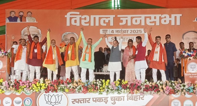 बिहार विधानसभा चुनाव के अंतिम चरण से पहले सियासी माहौल पूरी तरह गरमा गया है। इसी क्रम में एनडीए के स्टार प्रचारक और भाजपा केराष्ट्रीय अध्यक्ष जेपी नड्डा ने भोजपुर जिले के बड़हरा विधानसभा क्षेत्र के दौलतपुर खेल मैदान में विशाल जनसभा को संबोधित किया। मंच पर पहुंचतेही उन्होंने विपक्ष पर जमकर निशाना साधा और केंद्र व राज्य सरकार की विकास योजनाओं को जनता के सामने रखा। जनसभा में उमड़ी भारी भीड़ नेपूरे मैदान को चुनावी जोश से भर दिया। नड्डा ने भाषण की शुरुआत करते हुए कहा कि वह सबसे पहले प्राचीन काली मंदिर और वीर कुंवर सिंह कोनमन करते हैं। उन्होंने कहा कि यह चुनाव बिहार को विकसित राज्य बनाने का निर्णायक अवसर है। बिहार की विकास की गाड़ी 2005 के बाद पटरीपर आई है, अब इसे आगे बढ़ाना है। उन्होंने चेतावनी दी कि 1990 से 2005 तक का दौर अमावस्या की रात था। महागठबंधन पर कटाक्ष करते हुएकहा कि यह ठगबंधन और लठबंधन है जिसने बिहार को लालटेन युग में रखा, जबकि एनडीए ने उसे एलईडी के युग में पहुंचाया।