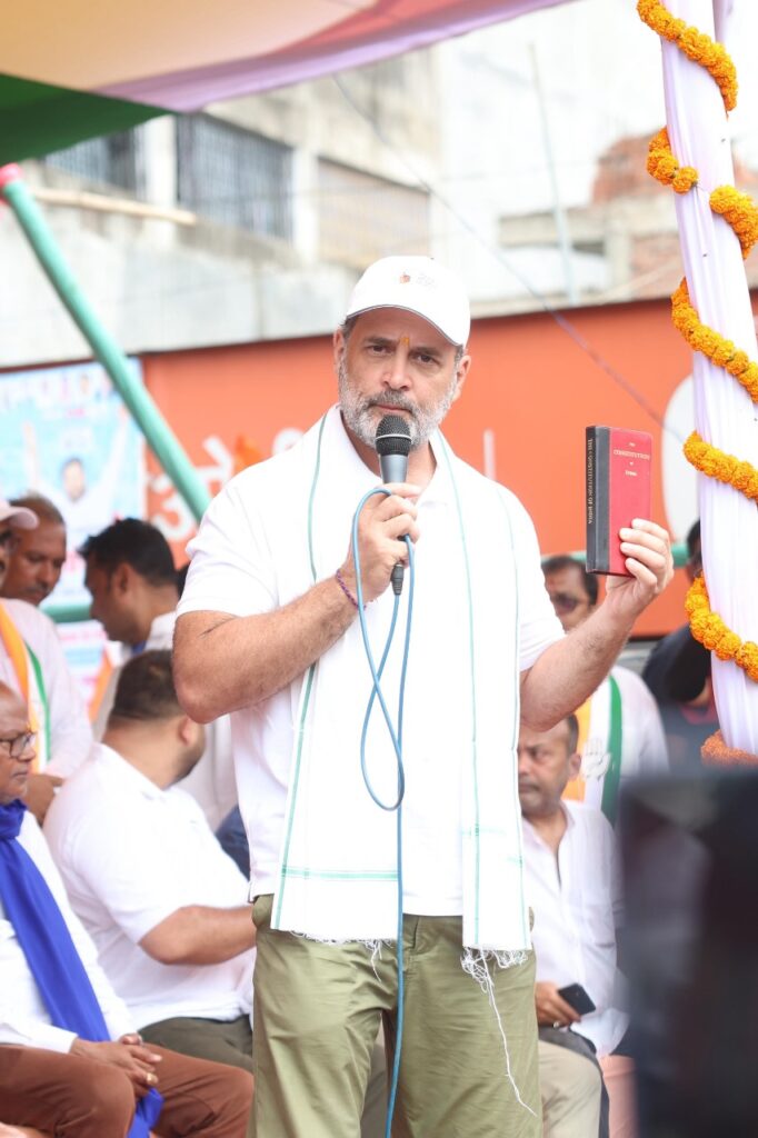 जनता से सीधा संवाद करते हुए राहुल गांधी ने कहा कि संविधान ने उन्हें अधिकार दिए हैं, लेकिन भाजपा इन्हें छीनना चाहती है. उन्होंने कहा कि बिहारमें मतदाता सूची से गरीब, किसान, दलित, पिछड़े, अल्पसंख्यक और अति पिछड़े वर्गों के 65 लाख लोगों के नाम काटे गए हैं लेकिन एक भी अमीरव्यक्ति का नाम नहीं कटा है. उन्होंने जनता को आगाह किया कि अगर वोट चला जाएगा तो उनके राशन कार्ड, जमीन और बाकी सारे अधिकार भीछिन जाएंगे. उन्होंने ये आरोप दोहराया कि भाजपा सरकार देश का पूरा धन अडानी-अंबानी को सौंप रही है.